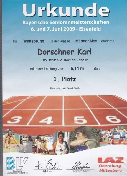 Karl Dorschner vom TSV Dörfles-Esbach war der überragende Sportler der M 55. Mit tollen 12,50 Sek. im 100 m Lauf, 25,54 Sek. im 200 m Lauf und 5,20 m im Weitsprung lag er klar vor der Konkurrenz und sicherte sich drei Titel.