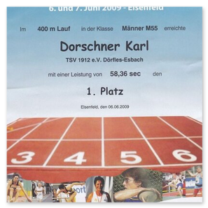 Erst 400 m Vorlauf: Locker herausgelaufen, am Ende hätte ich evtl. noch mehr zulegen sollen, um bessere Bahn hinter Michelchen zu bekommen.100 m Vorlauf: Fühlte mich auch gut, Bestzeit in 2009 mit 12,58 allerdings Rückenwind. Im Finale 12,63 ist auch eine gute Zeit für mich, drei waren schneller. 400 m Finale: Als Taktik hatte ich mir vorgenommen, gegen Michelchen hilft nur schnelles Angehen und hoffen, es hinten durchzustehen. Hatte leider das Pech, auf der ersten Geraden starken Gegenwind zu bekommen, so dass ich durch das schnelle Angehen einige Körner gelassen habe. Die letzten 50 m gingen dann etwas schwer und der starke Michelchen zog noch vorbei. Angesichts des Gegenwindes für mich trotzdem noch eine gute Zeit. 4x100 m Staffel: Erst um 18.30 Uhr gingen die Staffeln über die Bühne. Eberle lief die Kurve sehr gut, Wechsel auf Merk gut, dieser musste die Führung abgeben, Wechsel auf Schwab (ist eigentlich Langläufer!) etwas stockend, dieser verlor weitere zwei Plätze, Wechsel zu mir sehr gut, Schlussläufer der an dritter Stelle liegenden Staffel war ca. 6-7 m von mir weg. Ich konnte ihn im Ziel noch abfangen und unserer Stg Team Franken den dritten Platz retten. Sonntag Vorlauf 200m: Ich nahm mir vor, eine gute Bahn zu erlaufen, was mir mit 25,70 auch gelang, musste trotzdem nicht voll auslaufen. Im Finale fühlte ich mich gut, lag bis 50 m vor dem Ziel auf dem dritten Rang und hätte diesen vor dem Helmut Meier auch gehalten. Dann rächte sich scheinbar das kompakte Programm vom Vortag. Ich hatte kurzzeitig in beiden Beinen Krämpfe, so dass ich verlangsamen musste. Im Ziel waren diese wieder weg, aber die Zeit und der dritte Platz auch. Aber mit den beiden Medaillen kann ich auch zufrieden sein. Hauptsache, die Muskeln haben noch gehalten. Zwei 400 m Läufe am Tag ist schon etwas happig.
