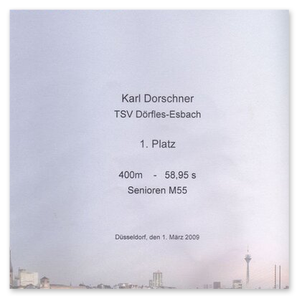 Durch die Sportlerwahl Frankens am Vortag fuhren wir (meine Frau und ich) um 3.30 Uhr in der Früh die 500 km bis Düsseldorf. Weiterhin war ich durch einen grippalen Infekt von der Vorwoche etwas skeptisch. Helmut Meier legte im 1. Lauf mit Manfred Schäler ein gute Zeit vor: 59,41 sec. In meinem Lauf lief hinter mir Rudolf König auf Bahn 3, von dem ich wußte, daß er evtl. schnell anlaufen würde. Dementsprechend gab ich die ersten 200 m Gas, die Durchgangszeit lag bei 26-27 sec., das war eigentlich etwas zu flott. Die nächsten 100 m nahm ich etwas Tempo heraus und wartete auf Rudolf. Obwohl die letzten 50 m diesmal schwer fielen (wie eingangs beschrieben), langte es mit einer 58,95 sec doch noch vor Helmut zum Titel.
