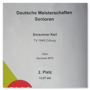 Meine drei Wettkämpfe 100 m in 13,80 se, 200 m in 27,89 sec und die 400 m in 64,94 sec konnte ich überlegen für mich entscheiden. Bei den 400 m agierte ich verhaltener, da wir danach noch die DM Qualifikation für die 4x100 m unseres Team Franken in der M 60 erreichen wollten. Das gelang dann auch in 55,57 sec, Qualizeit war 58 sec. Somit bekam ich vier Bayerische Seniorenmeisterwimpel überreicht. Der Ablauf funktionierte problemlos, ein großes Lob an den Ausrichter mit seinen Helfern.