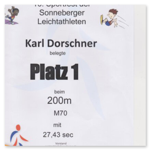 Ein weiterer Formtest stand bei der Bahneröffnung in Saalfeld an. Schon ein paarmal konnte ich bei Rudolf König und seinem fleißigen Team Gast sein. Das Wetter war sonnig und um die 23 Grad. Bei leichtem Rückwind konnte ich neben Rudolf im 100 m Lauf mit 13,40 und leichtem Rückenwind eine sehr gute Zeit laufen. Beim Start der 200 m, ich hatte im Männerlauf auf der äußeren Bahn den Rudi im Nacken, blies ein ganz schöner Gegenwind. Leider kam ich nicht so gut aus dem Startblock und so war Rudolf nach 50 m schon an mir dran und zog vorbei. Bei den letzten 50 m konnte ich mich wieder etwas heransaugen. Die 28,05 sec sind noch verbesserungsfähig.
