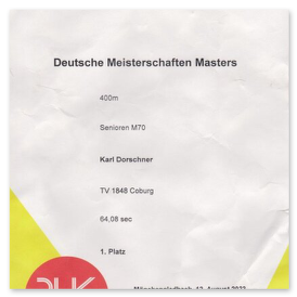 Heisses Wetter bis 32 Grad empfing die Teilnehmer dieser Bayerischen Seniorenmeisterschaft in Lauf und Sprung. In den Sprints der M 70 100 m mit 13,74 sec 200 m in 29,93 sec und 400 m in 64,46 sec sowie mit der Staffelgemeinschaft des Team Franken in der M 60 in 55,29 sec konnte ich jeweils den 1. Rang erringen und Bayerischer Meister werden. Die 200 m gestaltete ich etwas lockerer ob des anstehenden 400 m Laufes, da es doch ein ganz schönes Programm war und sich über den ganzen Tag zog. Die 400 m Zeit kam nahe an die kürzlich in Erlangen erzielte Weltbestzeit in der M 70 heran. Die Staffelzeit bedeutete die Qualifikation für die Deutsche Meisterschaft der Senioren in Mönchengladbach. Die Wärme schlauchte ganz schön und Trinken war angesagt. Die Organisation verlief nach Anlaufschwierigkeiten dann gut.